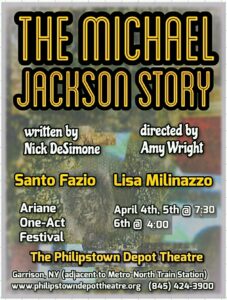 ‘THE MICHAEL JACKSON STORY’ a one-act play written by Nick DeSimone, directed by Amy Wright, will featured in Aery’s ARIANE SHORT PLAY FESTIVAL at Philipstown Depot Theater in Garrison, NY.  Starring Santo Fazio & Lisa Milinazzo.  Fri & Sat, April 4th, 5th (@ 7:30pm) & Sun, April 6th @ 4pm.  TICKETS: