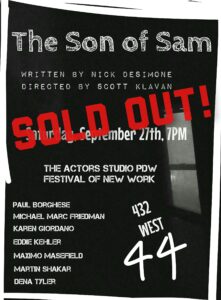An excerpt from ‘THE SON OF SAM’ a new full-length play by Nick DeSimone, was presented at THE ACTORS STUDIO/ PDW on Tuesday, October 22nd.  Starring Tony Torn, Andrea Gallo, Robert Funaro, Martin Shakar, Lisa Milinazzo and Eddie Kehler.  Directed by Scott Klavan.